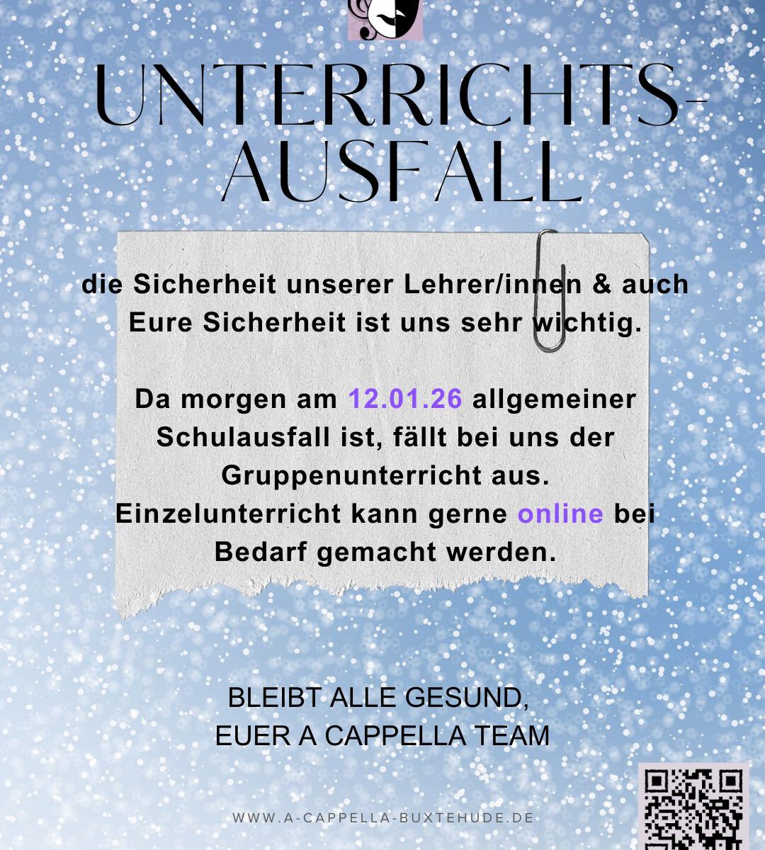Am 12.01.26 fällt der Präsenzunterricht aus (Gruppe)! Einzelunterricht kann gerne online bei Bedarf gemacht werden.