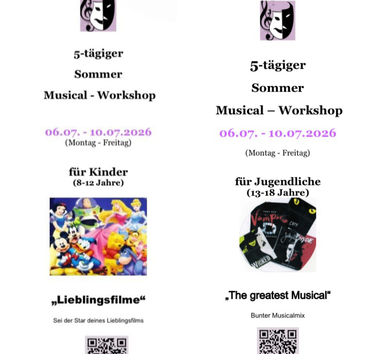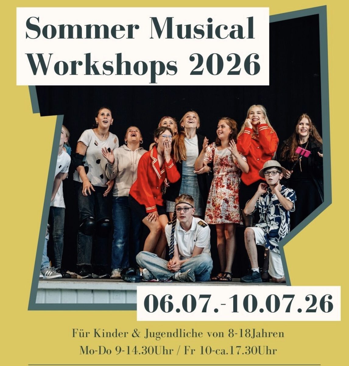Unsere diesjährigen Sommer Musical Workshops für Kinder & Jugendliche sind vom 06.07-10.07.26. Flyer senden wir gerne bei Nachfrage zu.
